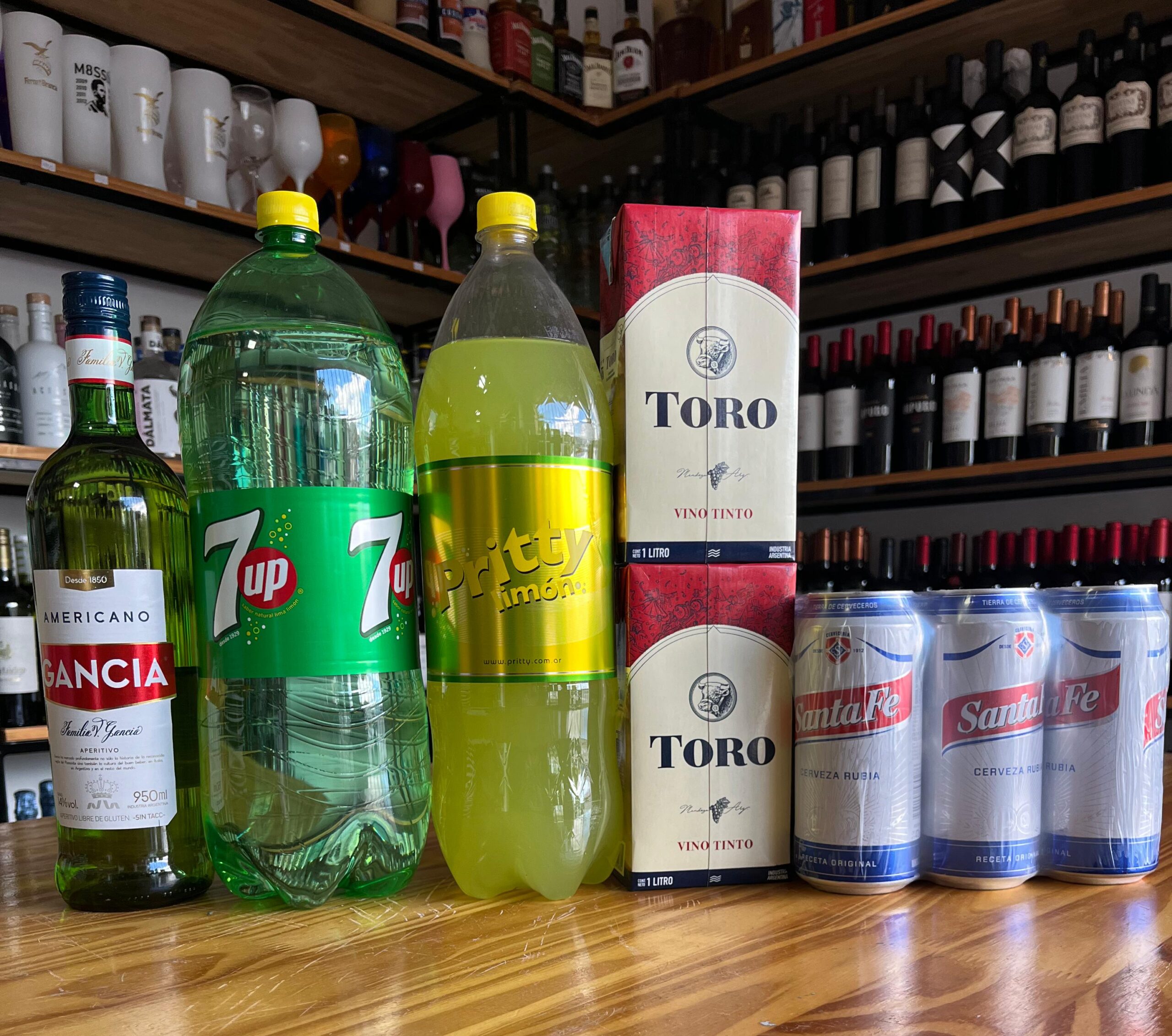 Gancia 950cc + Seven 3l + 2 vinos toros + Pritty 2.25 + Six pack santa fe